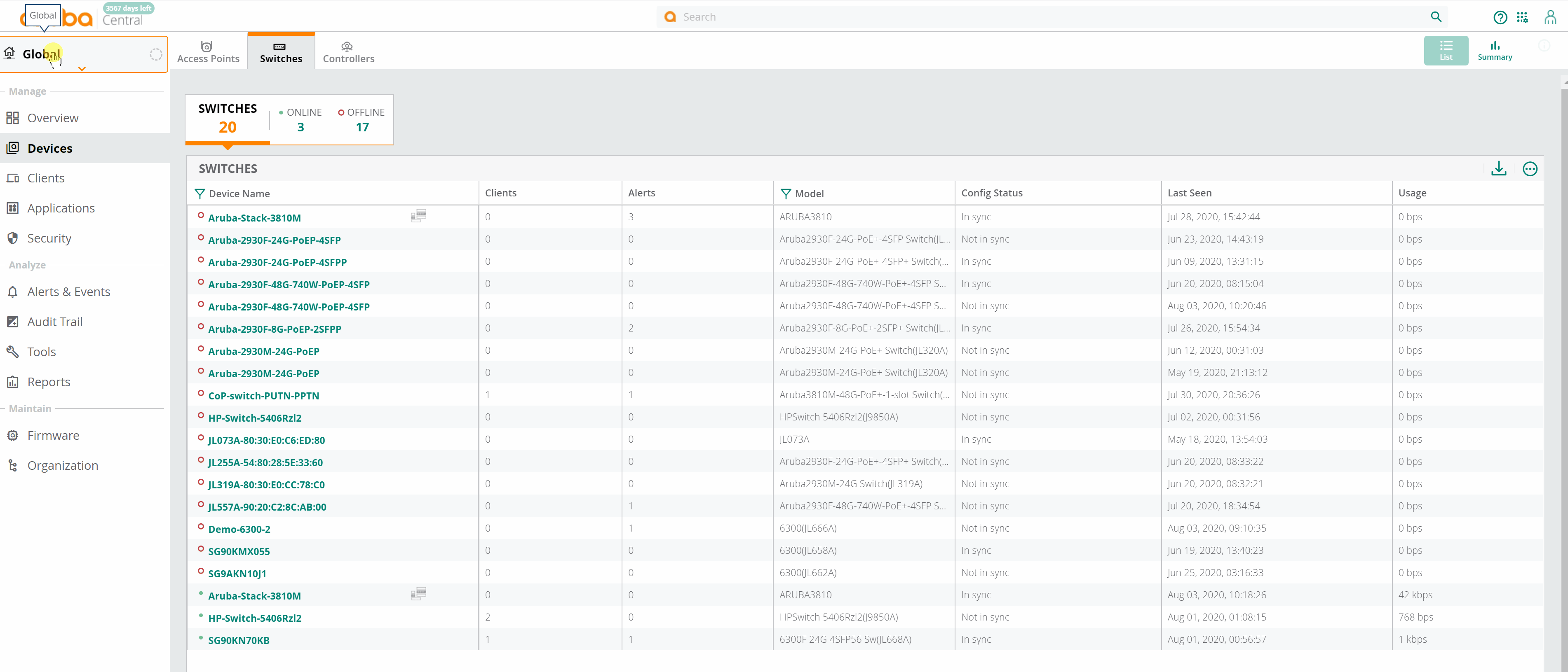A list of switches is displayed in the view.