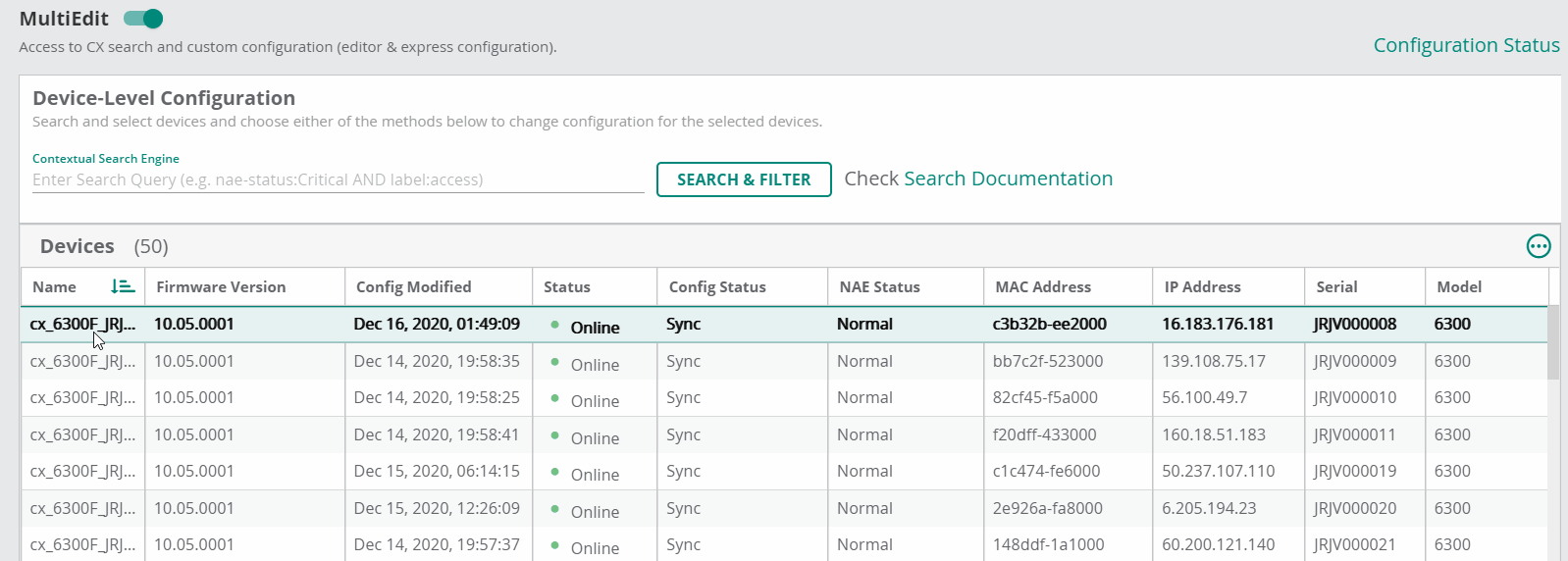 In the MultiEdit mode, the Contextual Search Engine allows you to filter a set of AOS-CX switches using search queries. The search queries can contain one or more search terms in the format, label:value. For example: model:6300F, where model is the label and 6300F is the value. When a search query contains a list of terms, by default, all terms are required to match. For example, the search query "model:8400 current-firmware:10.04.0001" will return only 8400 switches running 10.04.0001 firmware. The filtered switch details are displayed in the Devices table.