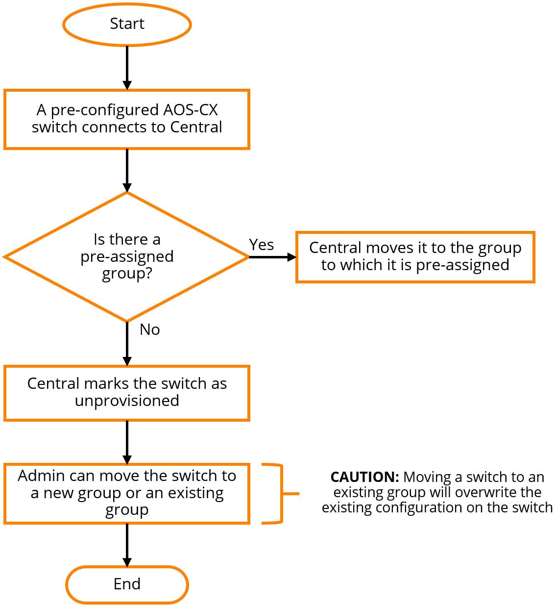 When the switch connects to Aruba Central (on-premises), Aruba Central (on-premises) automatically assigns it to the pre-assigned group. The following figure illustrates the provisioning steps for each group type.