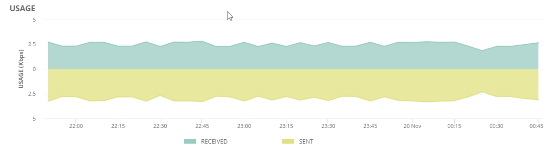 section displays the trend chart for client data traffic detected on the switch. Hover the mouse over the trend chart to view data transmitted and received at a particular time.Figure 6 Usage Graph