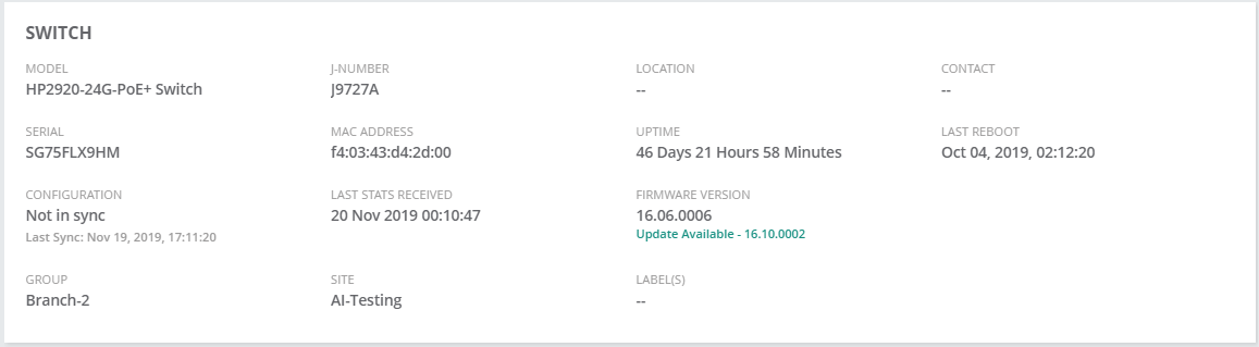 section displays the following details:- AOS-CX switches, a value is displayed only if the IP address is configured for the management interface of the switch. If IP address is obtained from the DHCP server, this field will appear blank for AOS-CX switches. —IP address of the switch. For