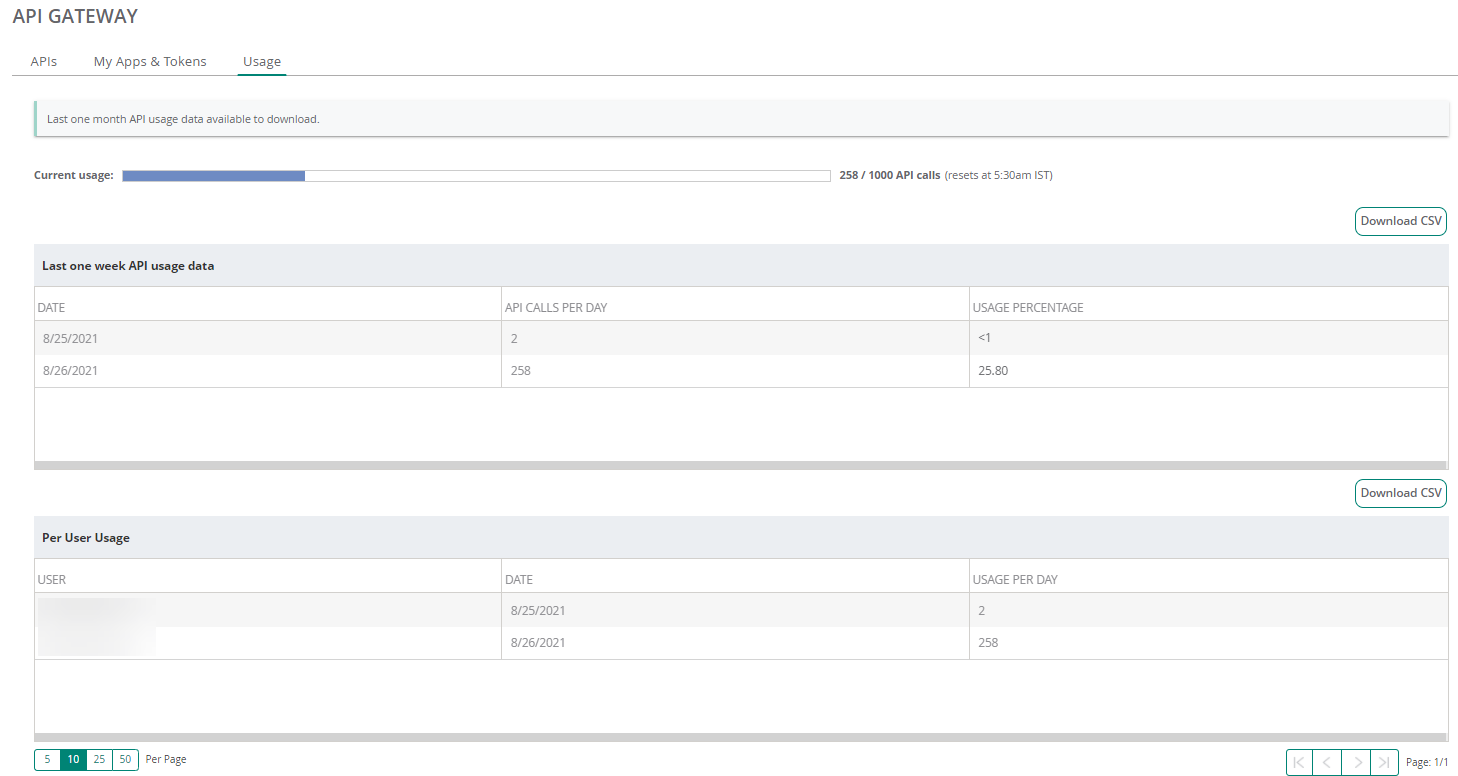 . The following details are displayed: - To download the API gateway usage statistics, Click for the respective usage type to download the stat file in CSV format.