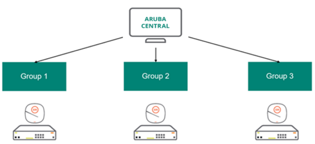 The following figure illustrates a generic group deployment scenario in Aruba Central: