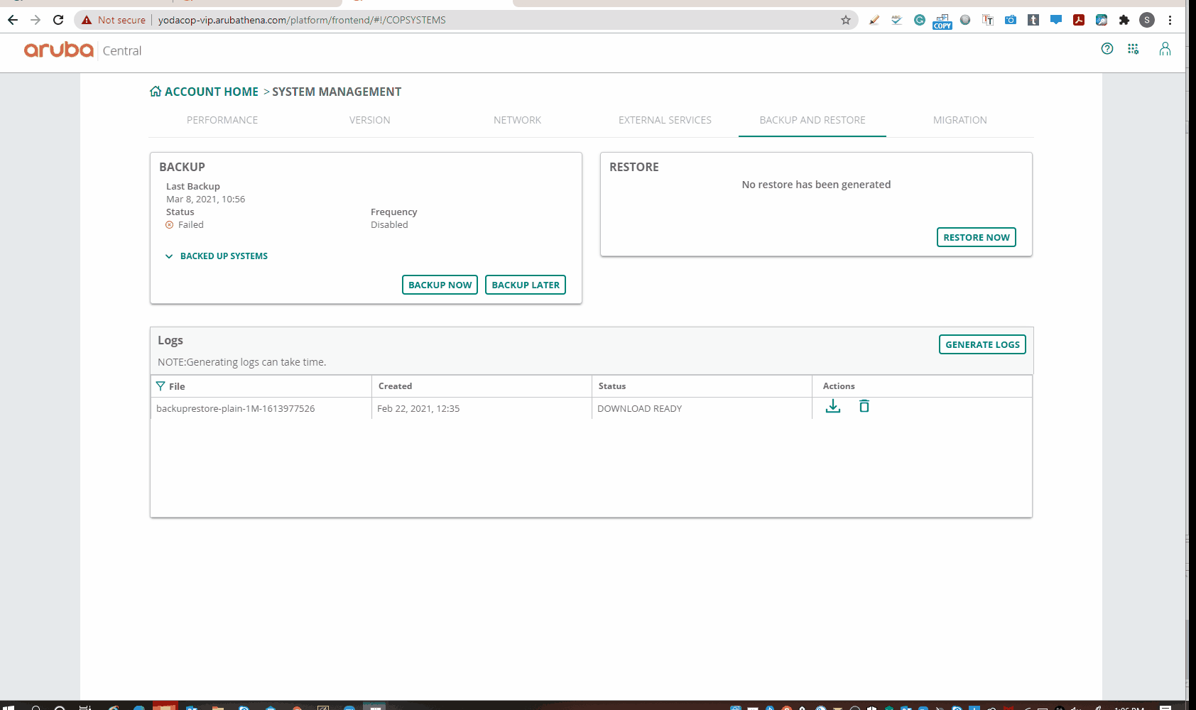 Aruba Central (on-premises) supports backing up of system information, group configuration data, alerts, events, audit trail, sites, labels, and historical reports. You can backup Aruba Central data either manually or set a schedule for an automatic backing up of the data.