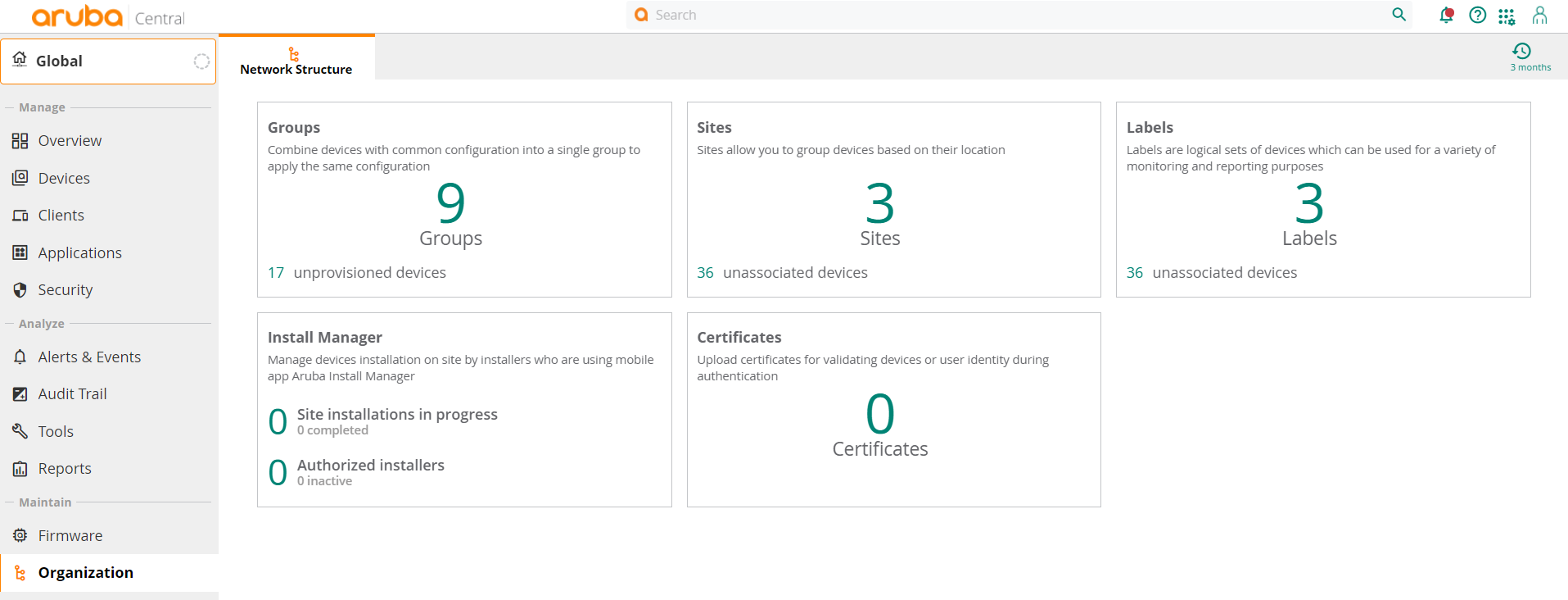 The Network Structure page shows tiles view for groups, sites, labels, install manager, and certificates sections. You can click on a tile to navigate to the respective page in Aruba Central.